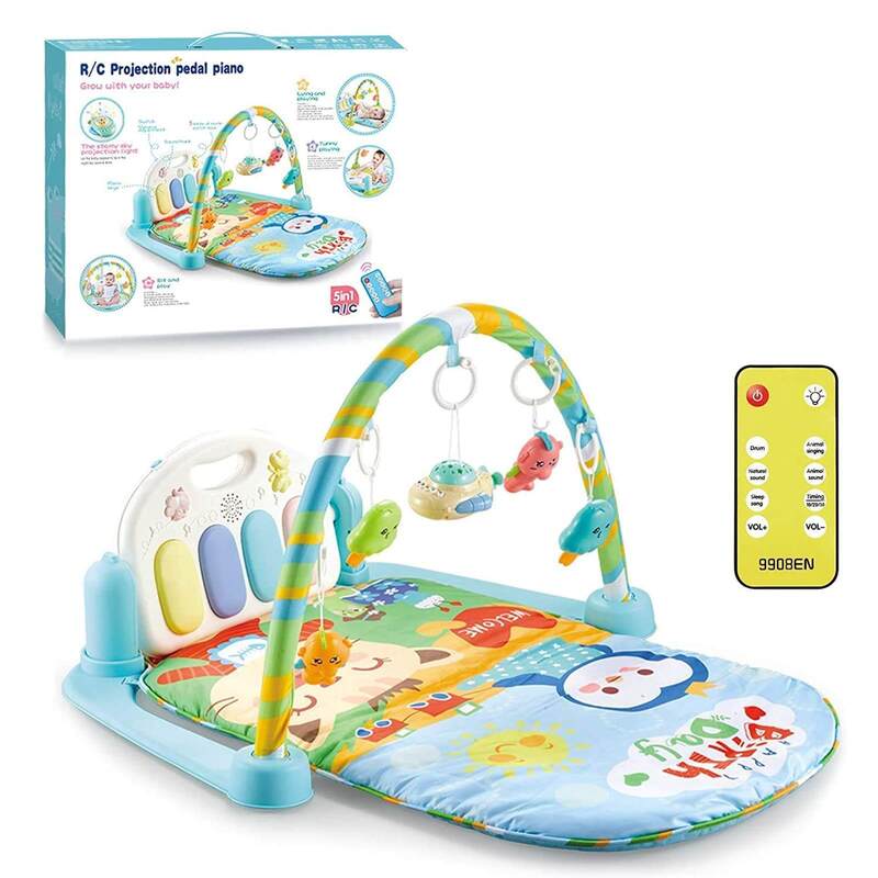 Engage your baby with the R/C Projection Baby Piano Playmat, featuring remote-controlled projection, interactive piano keys, and hanging toys for fun and early development.